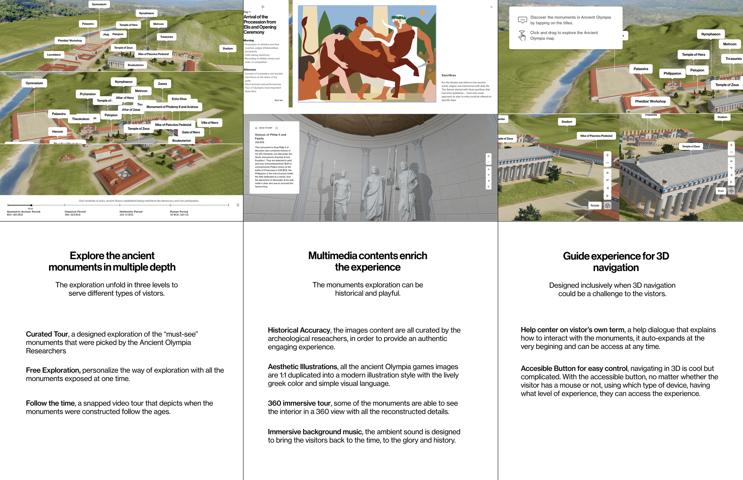 On the content side, the visitors can explore the ancient Olympia game activities that happened in the monuments, the lively illustration and designed background music are aimed at bringing visitors back to the old dates.